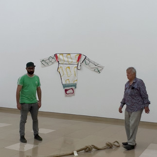 LE 13 OCTOBRE 2023, accrochage des peintures, montage des objets, pose des cordes. Regard de Benoît. Jean-Adrien à la corde, Géraldine à la montre, Delphine à la face de D"Jay. Claude du concentré de Claude ; et ciel de Nîmes.